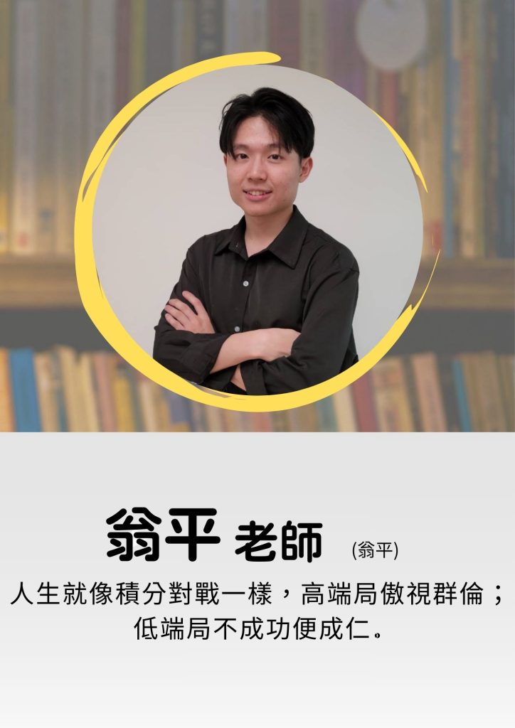 教授高中英文近十年時間,從不教授學生死文法,而是建立學生的語感,並把文法端與語感端結合,藉此融會貫通。也根據學生程度給予適當補充。不照本宣科,上課生動幽默,讓孩子在噴笑時已經記住單字了!還會拆解單字讓孩子無痛記憶字彙。力求學生發音精準,有助於學生聽力及口說能力。授課內容激發英文思考,遠離中式英文! 教學理念:老師靠英文翻身,希望孩子們也能把英文當作利器。教學用簡單、實際思維,宏觀角度看英文,帶學生脫離英文苦海,提升台灣學子英文程度。