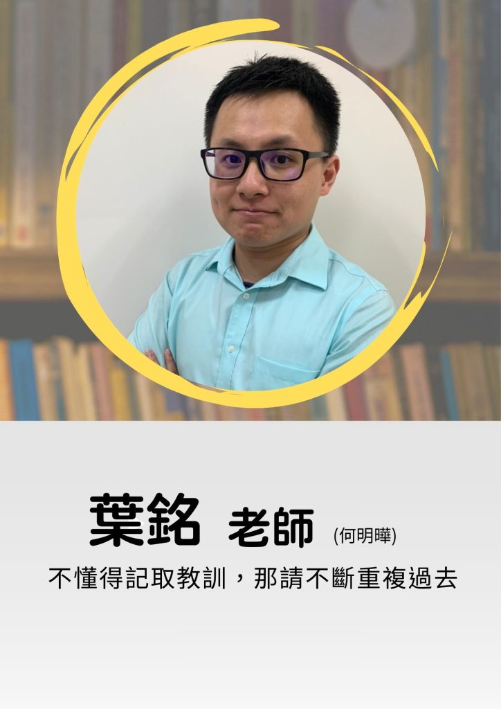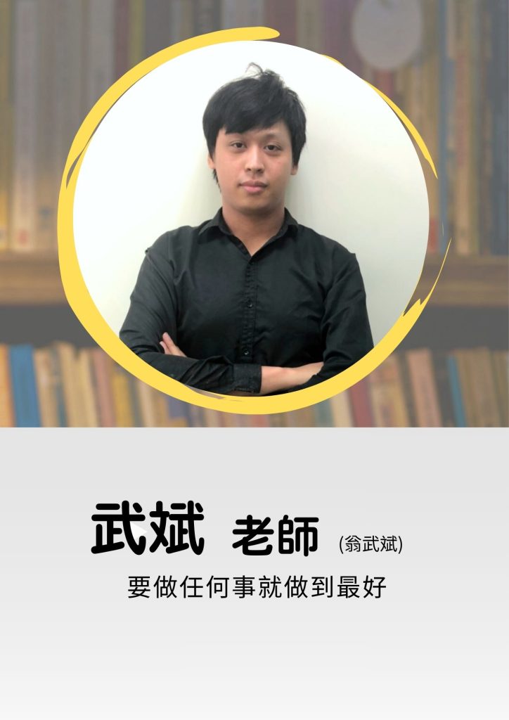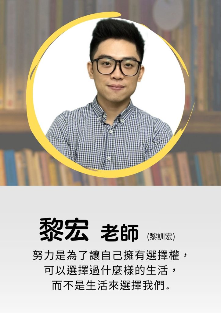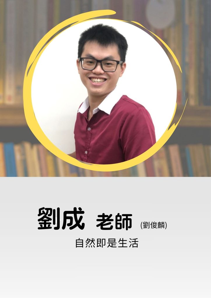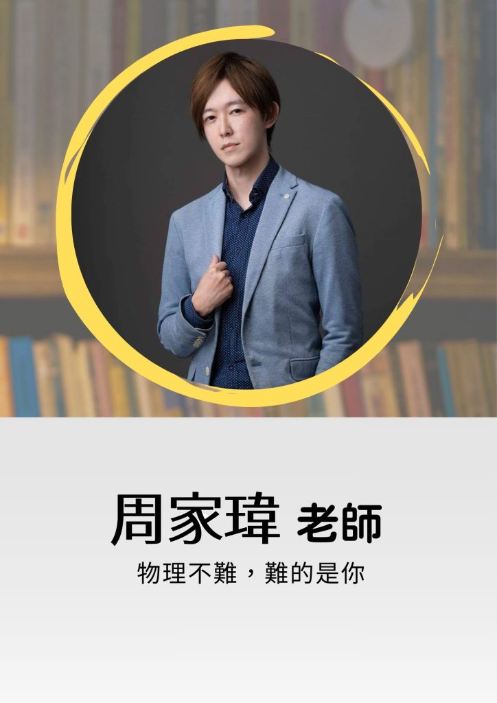 國語 英文 數學 自然 社會 數學科 黎宏老師│資歷教學經歷15年 臺灣師範大學物理系奧林匹亞物理競賽培訓選手前公立高中教師│教學特色生活即科學,科學即生活,將生活中的故事融入課程當中,以深入淺出的方式讓學生進入科學的世界│星座獅子座│做過最特別的事台灣人必做三件事:登玉山,騎車環島,泳渡日月潭。│想對學生說的話學習目的在於「學以致用」 學習最重要的事情,不一定指的就是讀書, 往往在學習過程的體會與感受,才是可以陪伴自己一生的軟實力。 願你愛上學習,成就更好的自己。 武斌老師│教學特色因本身學經歷,對於授課並非死板的照本宣科,而是將自身體驗(實驗室、醫院內)結合課內內容使學生吸收的知識是鮮活有趣的!│星座巨蟹座│做過最特別的事國中高中階段極度叛逆│想對學生說的話國中階段沒有讀不來的學生,要相信沒有任何事情是不用努力就有成果的,反之沒有任何的努力是做無用功的! 葉銘老師│資歷畢業於台灣大學應用物理研究所,本科系畢業、教育學程修畢雙北、桃園、新竹、台中、彰化、金門都有葉銘老師的授課足跡,接觸過的學生類型甚廣,能滿足不同學生的胃口。│教學特色葉銘老師善於將困難的內容,以幽默的比喻、生活實例、肢體表演、清晰邏輯……等各種不同的方式,讓學生可以迅速了解並吸收,因此常常會聽到學生說:「葉銘老師讓物理變得好簡單!」 葉銘老師不因為學生成績好或壞而改變對學生的態度,因為老師更希望的是看到學生「成長」,這也是葉銘老師為何能做到「有教無類」的原因,讓強者更強、讓中後段學生成長建立成就感。│星座射手座│做過最特別的事每週搭飛機到金門教書│想對學生說的話我從來不擔心學生基礎不好,因為我有把握我能夠講到你聽得懂;我從來不擔心我的所學不能滿足你,因為除了本來就很扎實的學科能力外,至今仍在閱讀眾多文章學習、進步。 如果牛頓是站在巨人的肩膀上看得更高更遠,期待你也能夠站在我的肩膀上進入物理的殿堂。 昱仁老師│資歷國立台灣大學電機工程學系國立台灣大學牙醫學系國立武陵高級中學數理資優班│教學特色身為在學習成長過程中持續接受高強度科學訓練的對象,除了課內學生所需熟知的基礎知識外,我更擅長深度解構化學以及各科的核心概念,使學生能夠更容易地掌握自然各科的聯結與脈絡,並引導學生們在課本外也能善用所學更深入的認識這個世界,讓孩子們在面對考題、生活、未來的學習等各種挑戰能夠更加自信且自在。│星座巨蟹座│做過最特別的事為了把落葉掃乾淨所以把樹砍了│想對學生說的話多思考多紀錄,那怕是天馬行空的想法都可以和我敘述分享。 劉成老師│資歷家教和小團班10年補教7年│教學特色上課較活潑互動,以白話的方式引導學生, 輔導多以課後閒聊方式以適合的方式幫助學生拿分│星座金牛座│做過最特別的事和學生下課直接去打球,害他差點沒坐到火車。│想對學生說的話只要你不放棄,讓我們來試試看探所未知的世界! 哲佑老師│資歷國立臺灣師範大學物理學系│教學特色導師出生,與學生互動良好解說詳細,使學生容易理解專業解題,寫題目簡單快速板書精美,重點清晰好整理幽默風趣,學習輕鬆無壓力│星座水瓶座│做過最特別的事在學校放煙火&烤肉基本上學校沒說可以做的事都做過整個人從小反骨到大│想對學生說的話只要成績好 沒人會限制你想幹嘛 周家瑋老師│資歷台北教育大學數資所清華大學 Steam跨領域教育所│教學特色強調思考的重要性,直撃問題核心,讓學生在清晰邏輯引導下能更深入理解物理抽象概念,不用淪陷在無止境的背題目中│想對學生說的話好記又好笑的口訣,深度思考後的結果要用SOP收割,跟著老師節奏走一二三GO~